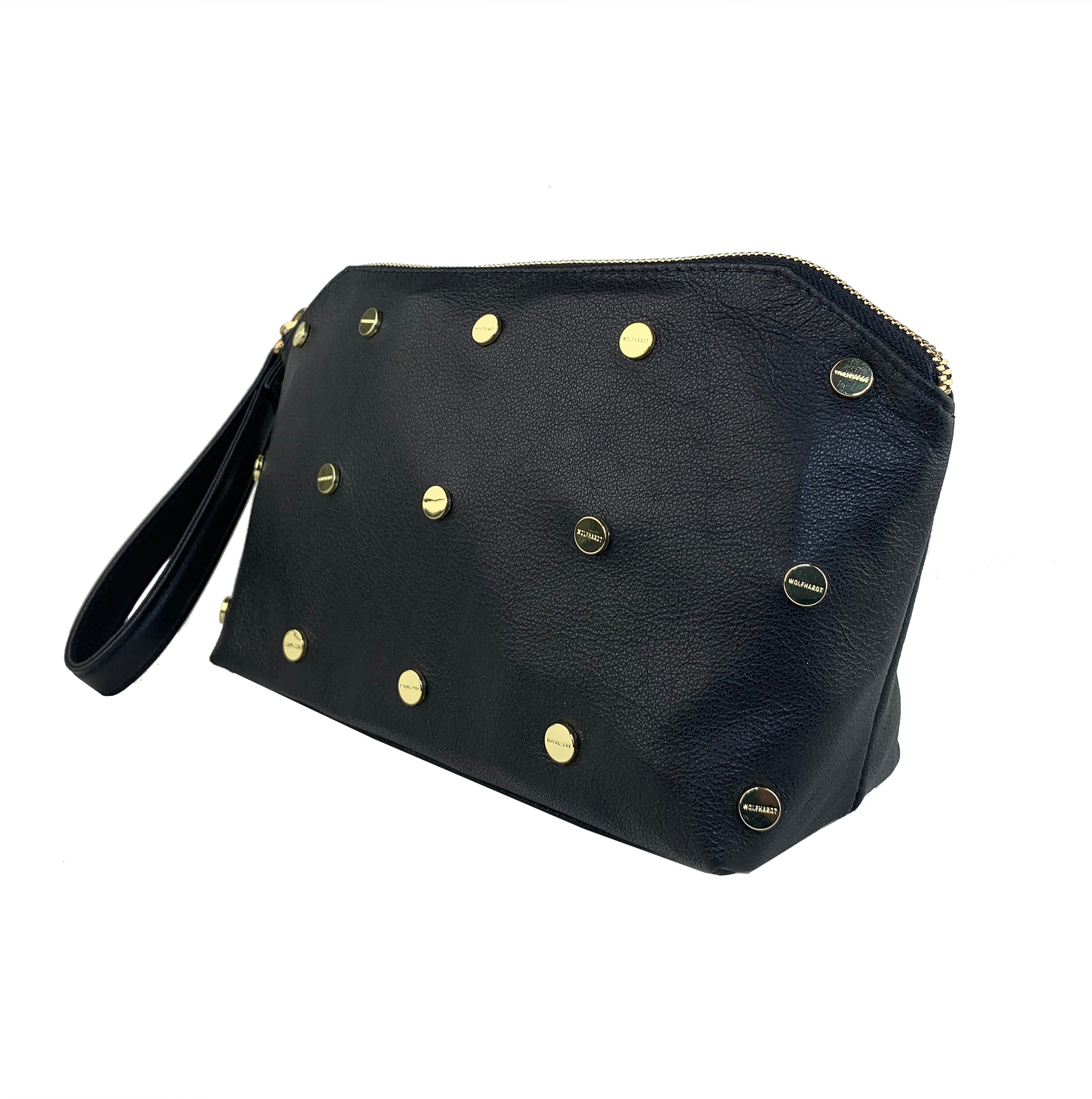 The black leather women's clutch named Eben is made from 100% cow leather and studded metal hardware. Shiny gold zip closure with a lined inside pocket. Each clutch is made specifically for you. Made to order.